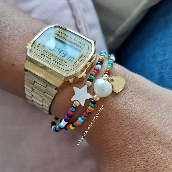 Doble pulsera elaborada en mostacilla de colores, perla de rio, dijes en acero inoxidable.
